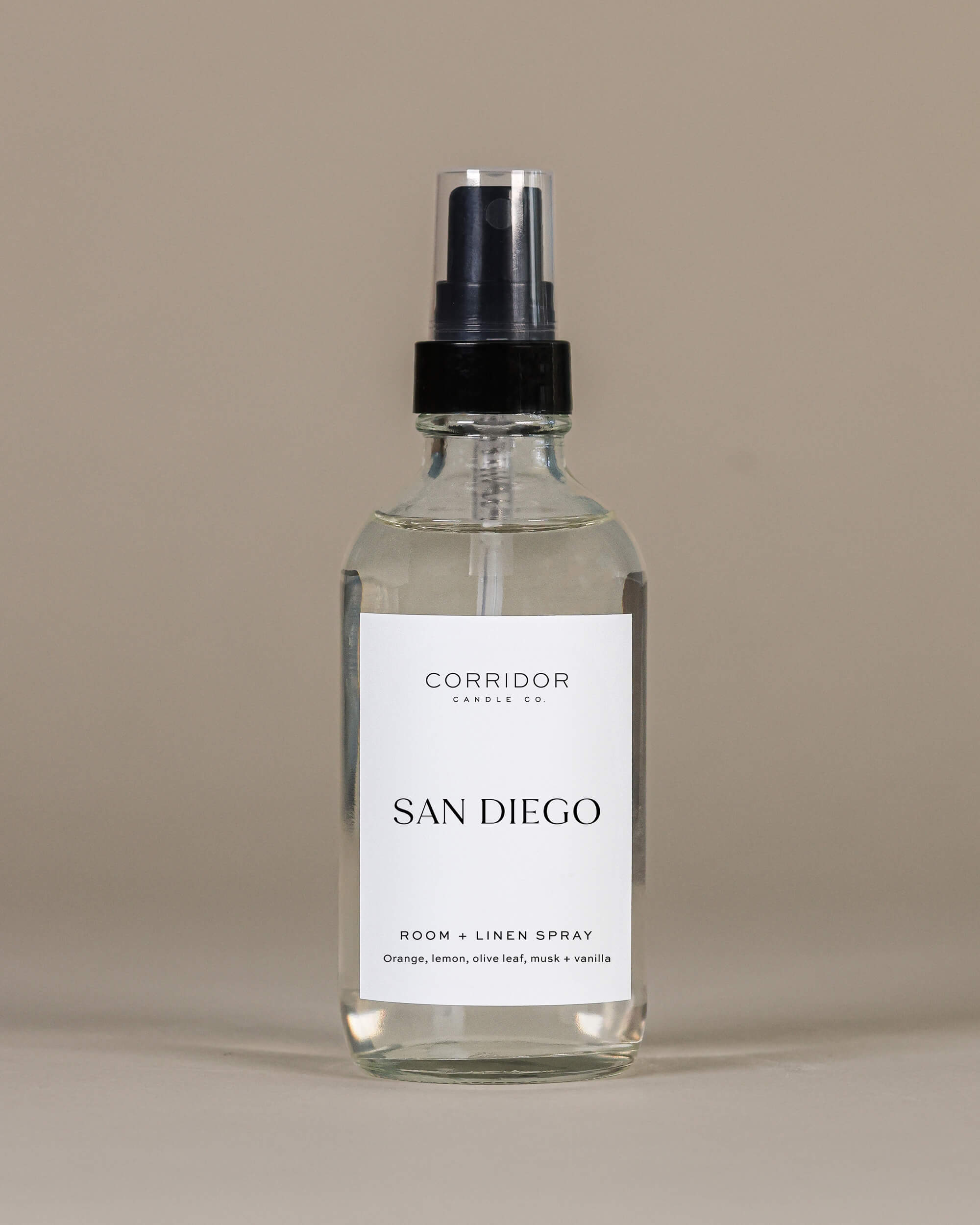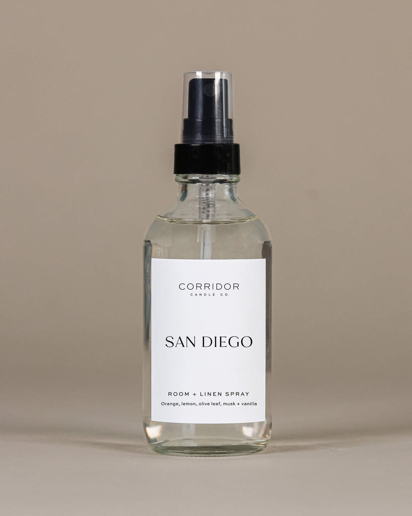 Bring a piece of San Diego into your home with our room + linen spray. This signature scent opens with bright notes of lemon and sweet orange, unfolds into green herbal layers and soft florals, and settles into a warm base of earthy musk and a hint of vanilla. Inspired by sunlit shores and breezy afternoons, it’s perfect for refreshing any room or adding a clean, uplifting fragrance to your linens.